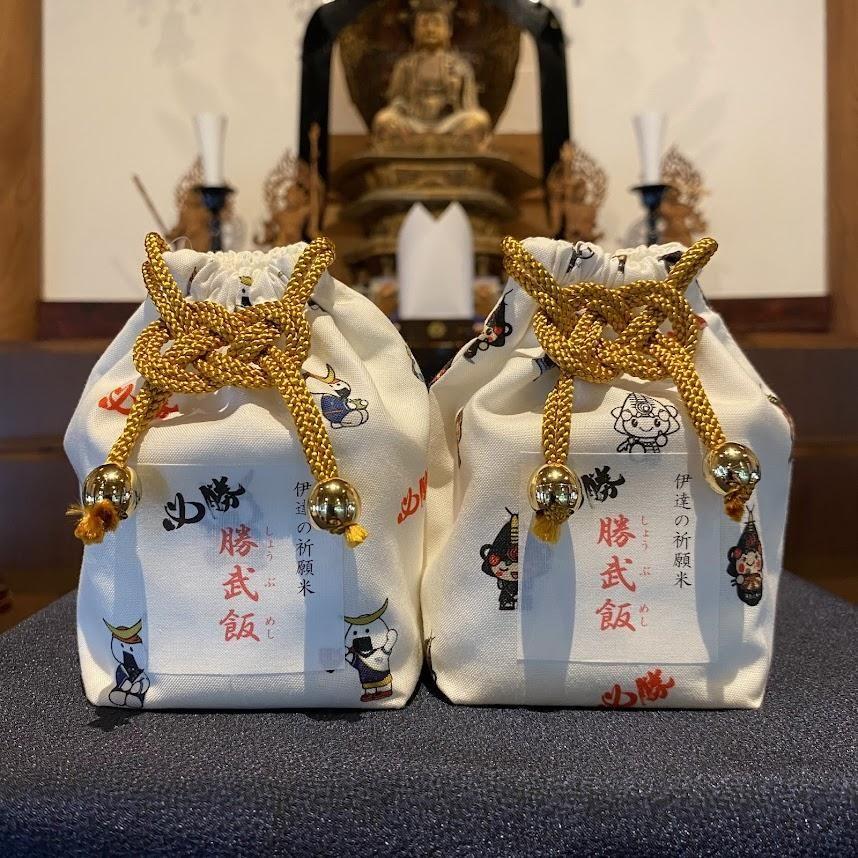 巾着には亘理伊達家の家紋入りで、勝武飯で炊いたおにぎり2個が入ります。いつでもどこへでも【勝武飯】を持っていけます。正面のラベルを剥がせば、小物入れとしても使用できる巾着です。